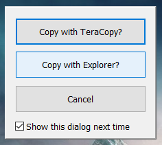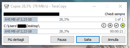 Scegliamo Copy with TeraCopy. La schermata di copia che si aprirà è la seguente: