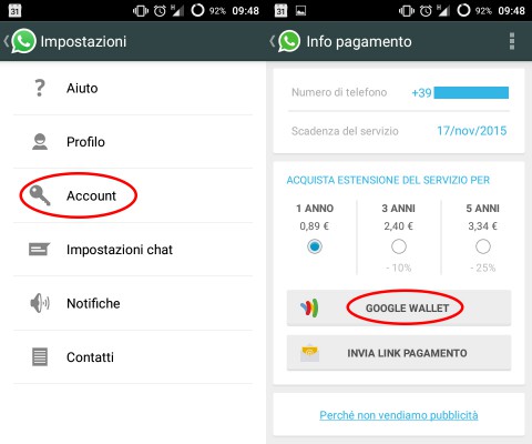 Per pagare Whatsapp su Android apriamo l’applicazione e clicchiamo sul pulsante Opzioni (Tasto fisico per i Samsung, oppure in alto a destra per i telefoni senza tasti fisici), andiamo su Impostazioni. A questo punto andiamo su Account, quindi su Info Pagamento. Su questa schermata scegliamo per quanti anni rinnovare Whatsapp, quindi clicchiamo su Google Wallet