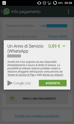 Prima di iniziare dobbiamo sapere alcune cose. Abbiamo bisogno di un metodo di pagamento valido per pagare Whatsapp su Andoid. Vanno bene carte prepagate, carte di credito, PayPal, codici Regalo Google Play, o Credito Telefonico (non per tutti gli operatori). Detto ciò possiamo iniziare.